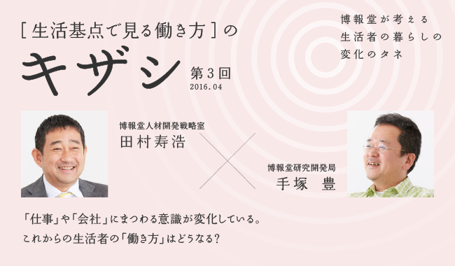 春、新生活のタイミングで公開の第三回目は、博報堂研究開発局・手塚豊(てづか・ゆたか)と博報堂人材開発戦略室・田村寿浩(たむら・としひろ)が、「生活基点で見る働き方」をテーマにこれからの生活者の働き方について語ります。